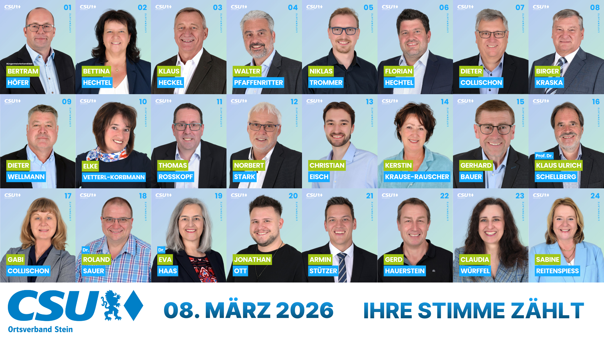 Hinter der CSU Stein stehen Menschen, die sich mit Leidenschaft für unsere Stadt einsetzen. Von der Fraktion im Stadtrat über den Vorstand bis hin zu unseren Kandidatinnen und Kandidaten – gemeinsam bilden wir ein starkes Team für Stein. Lernen Sie uns kennen!